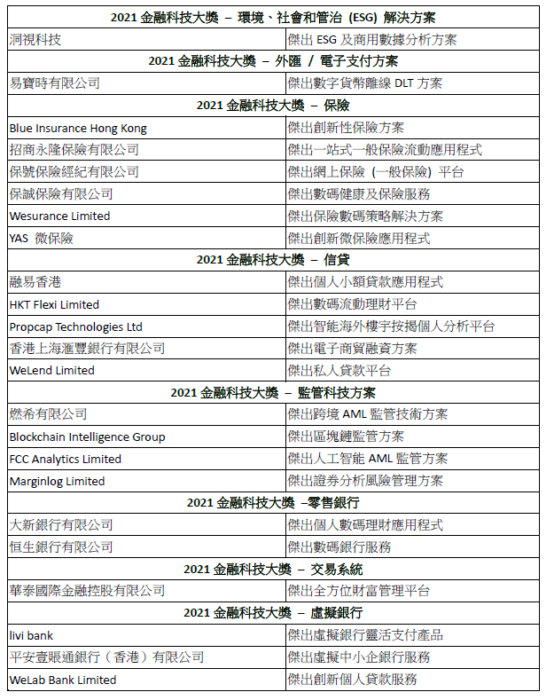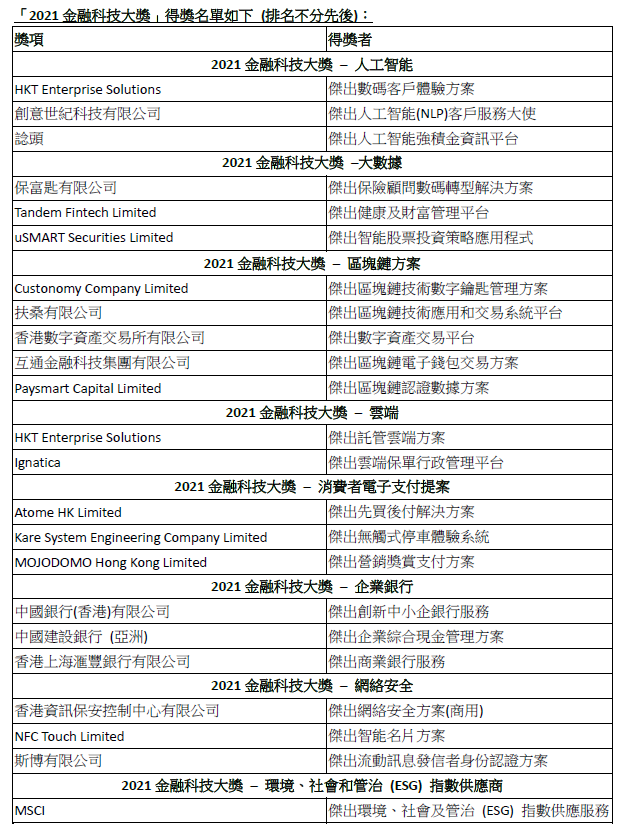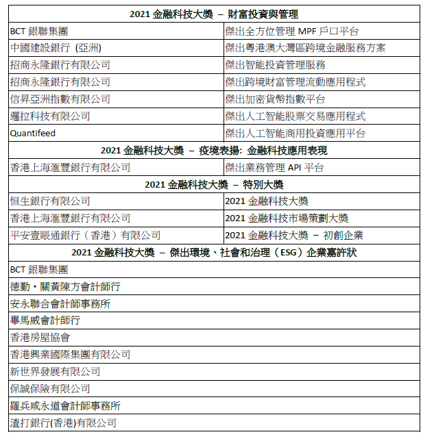 經濟通橫跨18大組別共54個獎項選出在各專業領域中傑出的得獎者,以肯定其在金融科技上的成就,為消費者、業界和社會帶來最大的效益。大會今年除了延續上一屆特別增設的「疫境表揚:金融科技應用表現」的獎項,由於今年踏入第五年,亦是經濟通連續第五年主辦「金融科技大獎」的重大里程碑,故此特別增設傑出「環境、社會和治理(ESG)嘉許狀」,共有十間獲大會頒發嘉許狀,以嘉許在ESG範疇上具實踐的機構,於面對環境、社會責任、公司治理與投資策略上,納入ESG元素以發掘機會來實踐,在疫情下也可以推動機構可持續發展。