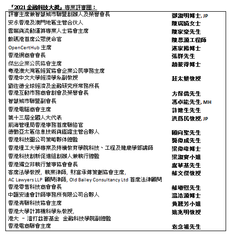 「2021金融科技大獎」得以順利舉辦,全賴各方大力支持,包括協辦機構及金融科技夥伴數碼港;協辦機構香港科技園公司;知識夥伴羅兵咸永道會計師事務所;策略夥伴安永會計師事務所、畢馬威會計師行以及智慧城市聯盟;德勤.關黃陳方會計師行、前海管理局的慷慨贊助,以及香港中文大學(中大)商學院商業可持續發展中心、粵港澳大灣區文創科技聯盟、香港電商聯會、香港互聯網及電子商務發展協會、香港網商會、香港科技創新促進組、香港零售科技商會、香港無線科技商會、互動廣告協會、互聯網專業協會、投資推廣署 、強制性公積金計劃管理局、香港射頻識別總商會、Startmeup.hk、香港科學園科培網絡、雲端與流動運算專業人士協會、香港銀行學會以及香港獨立非執行董事協會的鼎力支持。