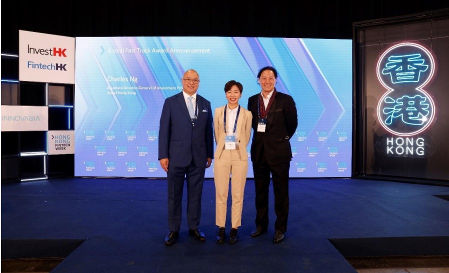 On photo: Charles Ng (left), Associate Director-General of Investment Promotion (Sector Specialists) and King Leung (right), Head of FinTech at InvestHK, with Christy Ho, Marketing Manager, Fano Labs - Global Fast Track Pitching Competition Winner 2021