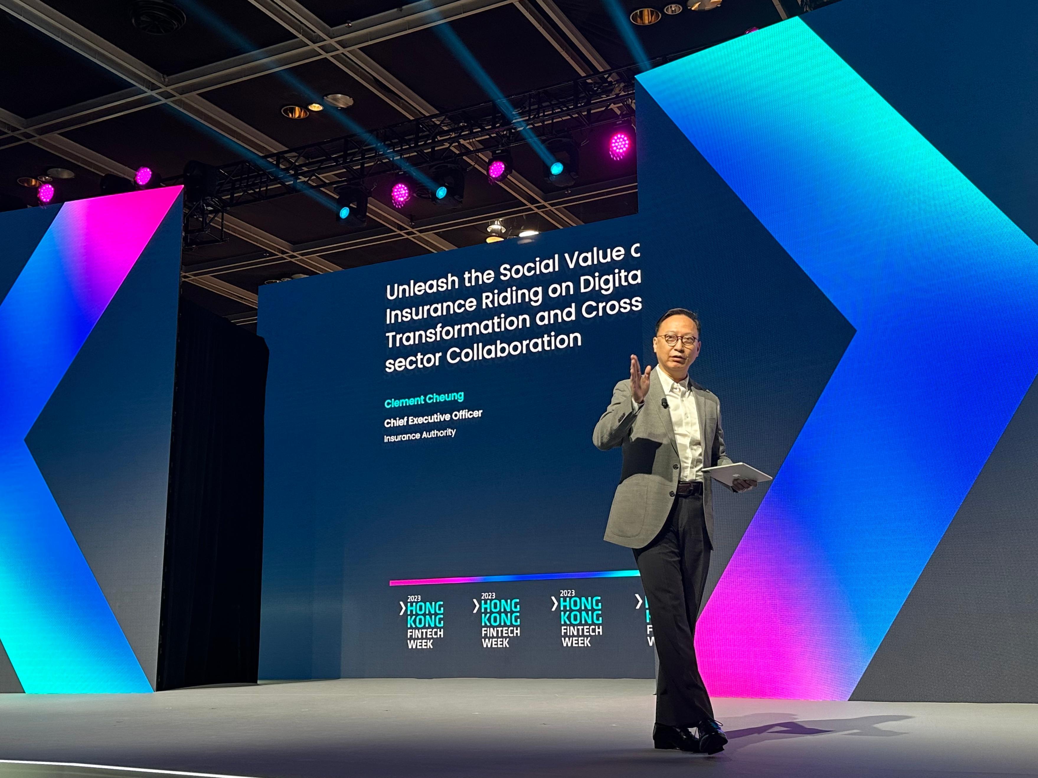 香港金融科技周2023於十一月五日圓滿結束,為期一周的金融科技盛事包括十月三十一日的大灣區日及十一月二日至三日的實體主論壇。保險業監管局(保監局)是香港金融科技周合辦機構之一。圖示保監局行政總監張雲正十一月三日於香港金融科技周2023致辭。