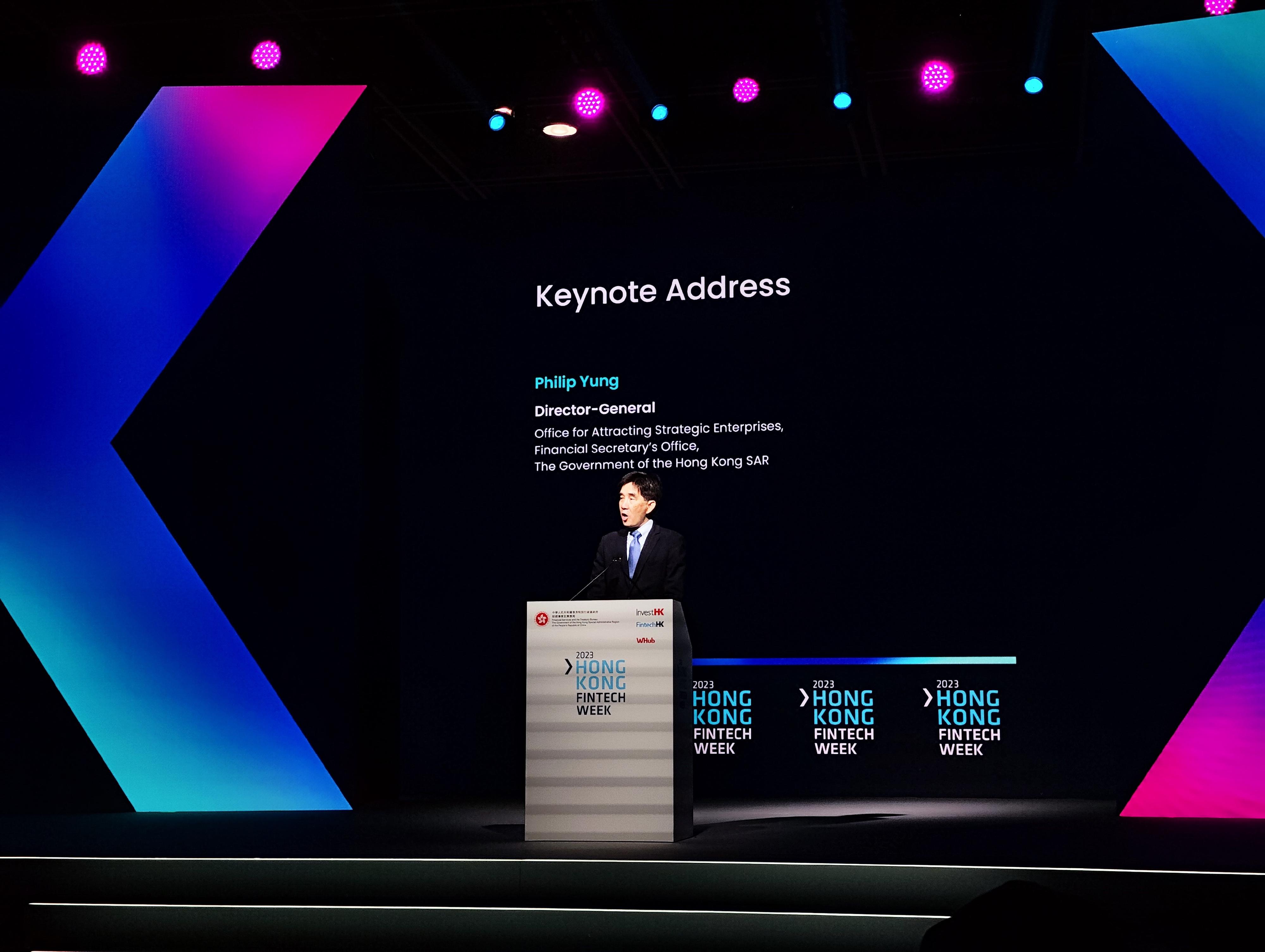 香港金融科技周2023於十一月五日圓滿結束,為期一周的金融科技盛事包括十月三十一日的大灣區日及十一月二日至三日的實體主論壇。圖示創新科技及工業局局長孫東教授十一月三日於香港金融科技周2023致辭。