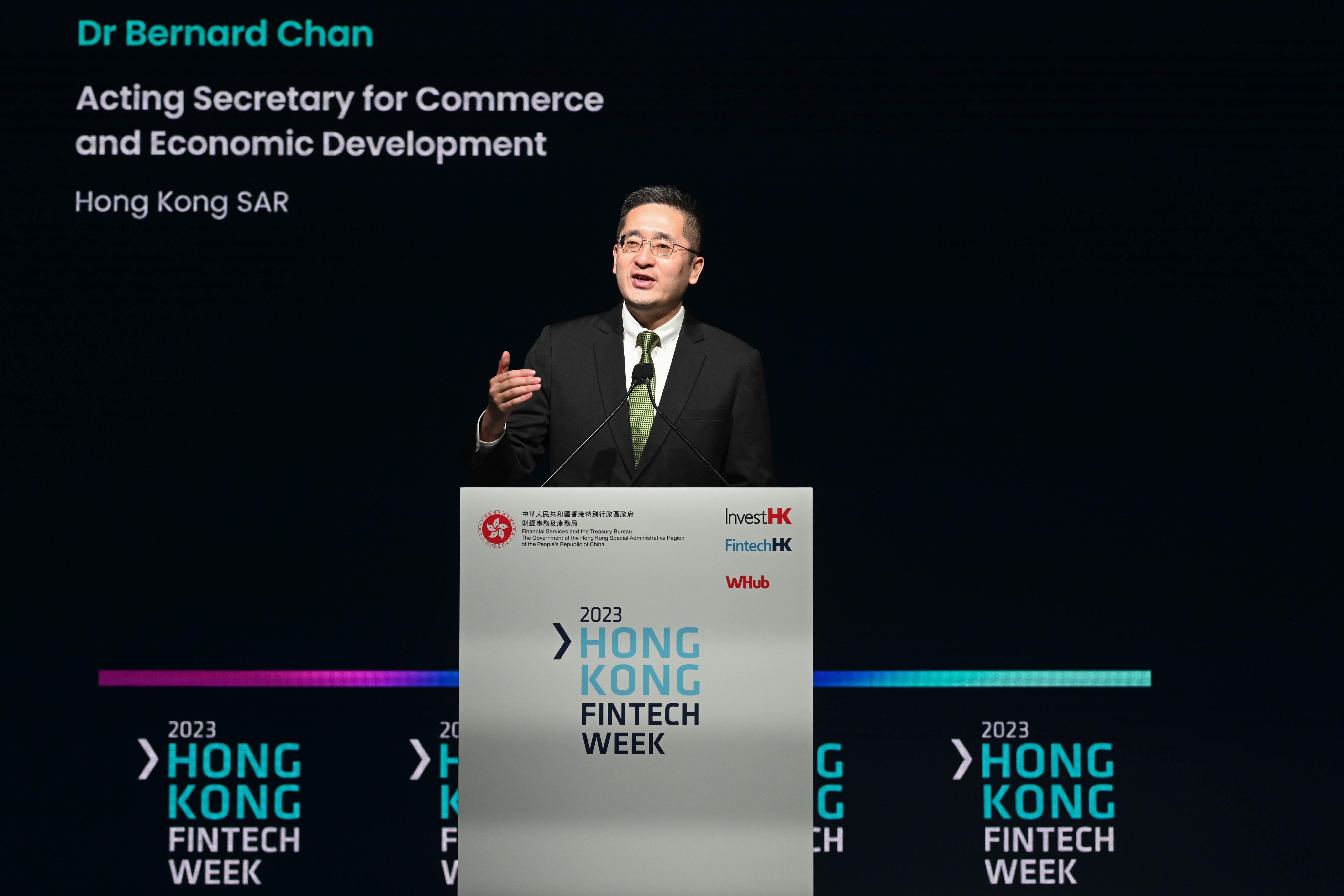 財經事務及庫務局局長許正宇於十一月二日在金融科技周主論壇上,公布三項聯動金融科技惠及實體經濟發展的主要措施,包括推出新的綜合基金平台;歡迎數字人民幣跨境使用,便利訪港內地旅客和前往內地的香港居民;以及促進虛擬資產和Web3.0領域與實體經濟相關的應用和創新,並進一步完善監管架構。他表示:「政府將與監管機構和主要市場參與者攜手推進各項措施,以期為日益壯大的金融科技生態圈注入新活力。」