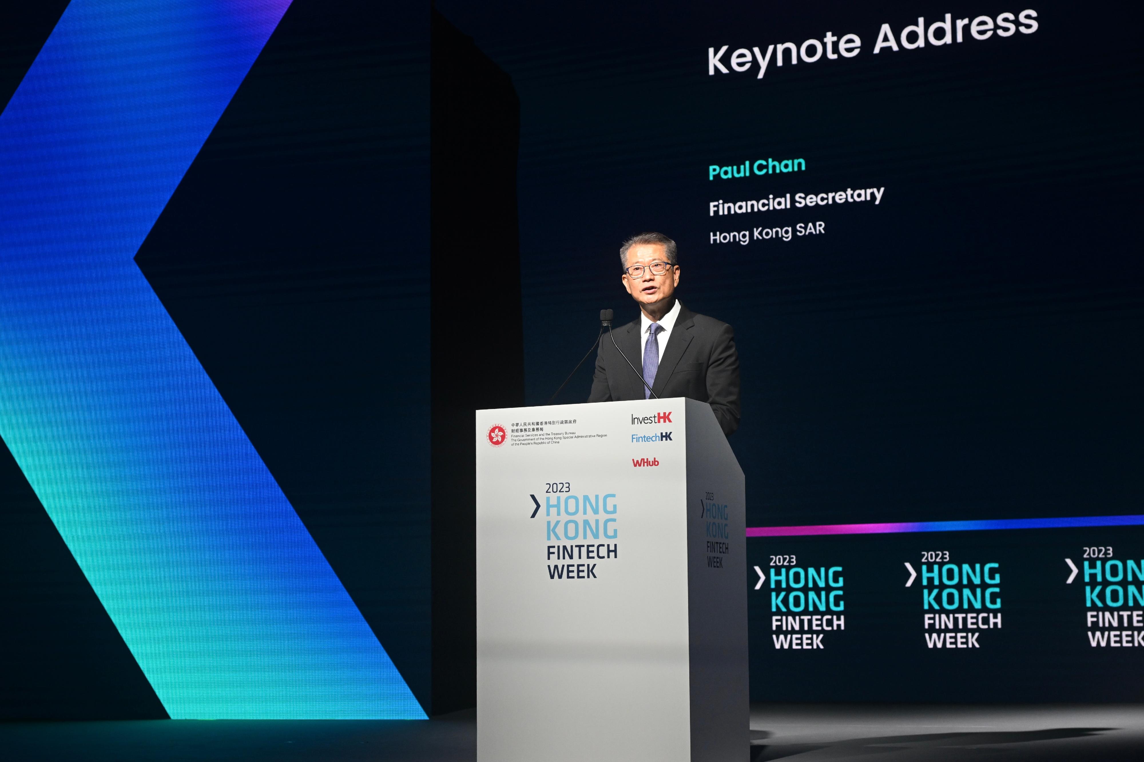 香港金融科技周2023於十一月五日圓滿結束,為期一周的金融科技盛事包括十月三十一日的大灣區日及十一月二日至三日的實體主論壇。圖示財政司司長陳茂波十一月二日於香港金融科技周2023致辭。