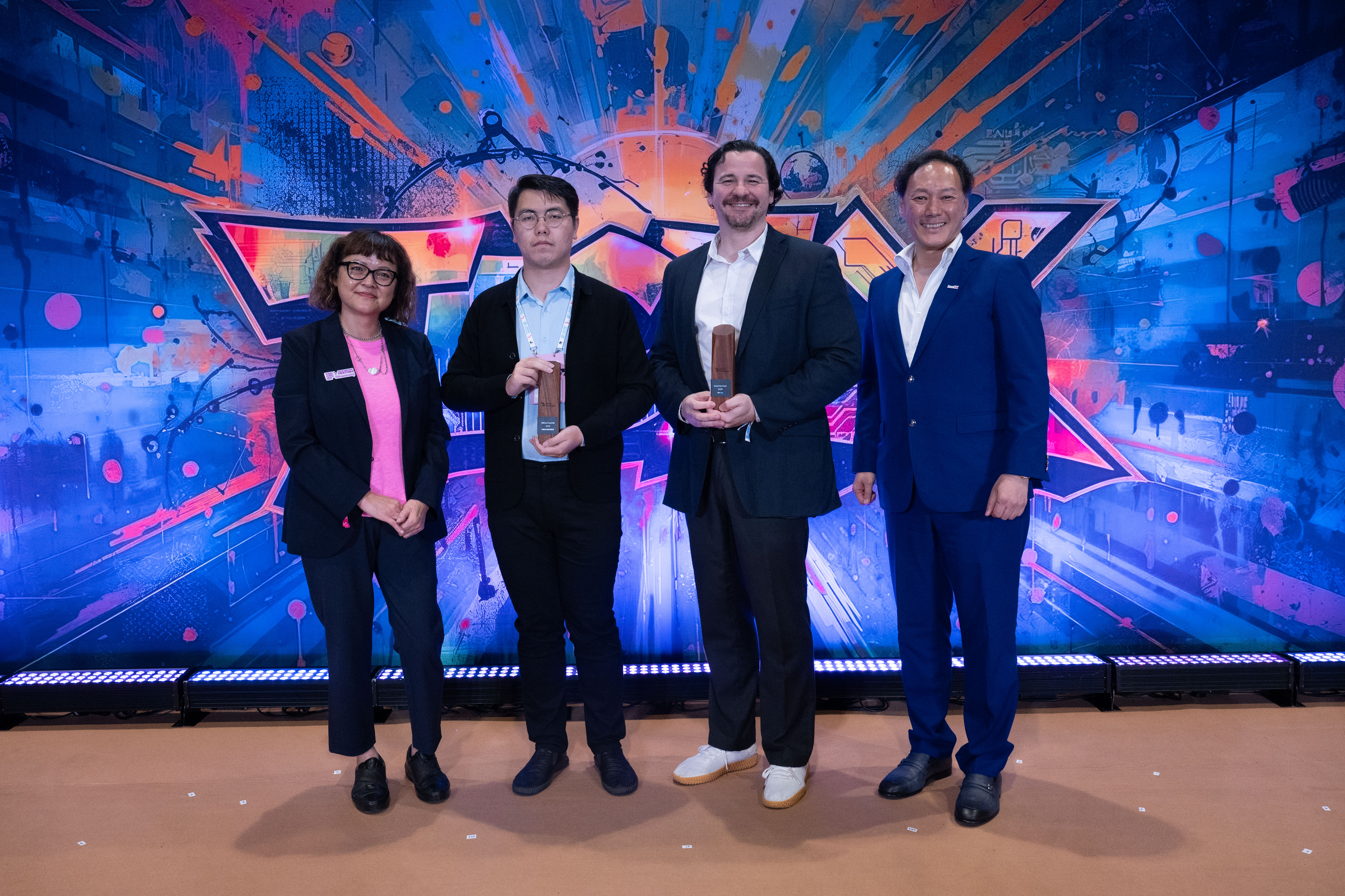 香港金融科技周 x StartmeupHK創業節2025主會議今日(十一月四日)圓滿結束。圖示投資推廣署初創企業總裁陳幗貞(左一)、投資推廣署金融服務及科技、可持續發展環球總裁梁瀚璟(右一),及全球Fast Track計劃2025比賽國際組別和中國內地組別的冠軍得主。